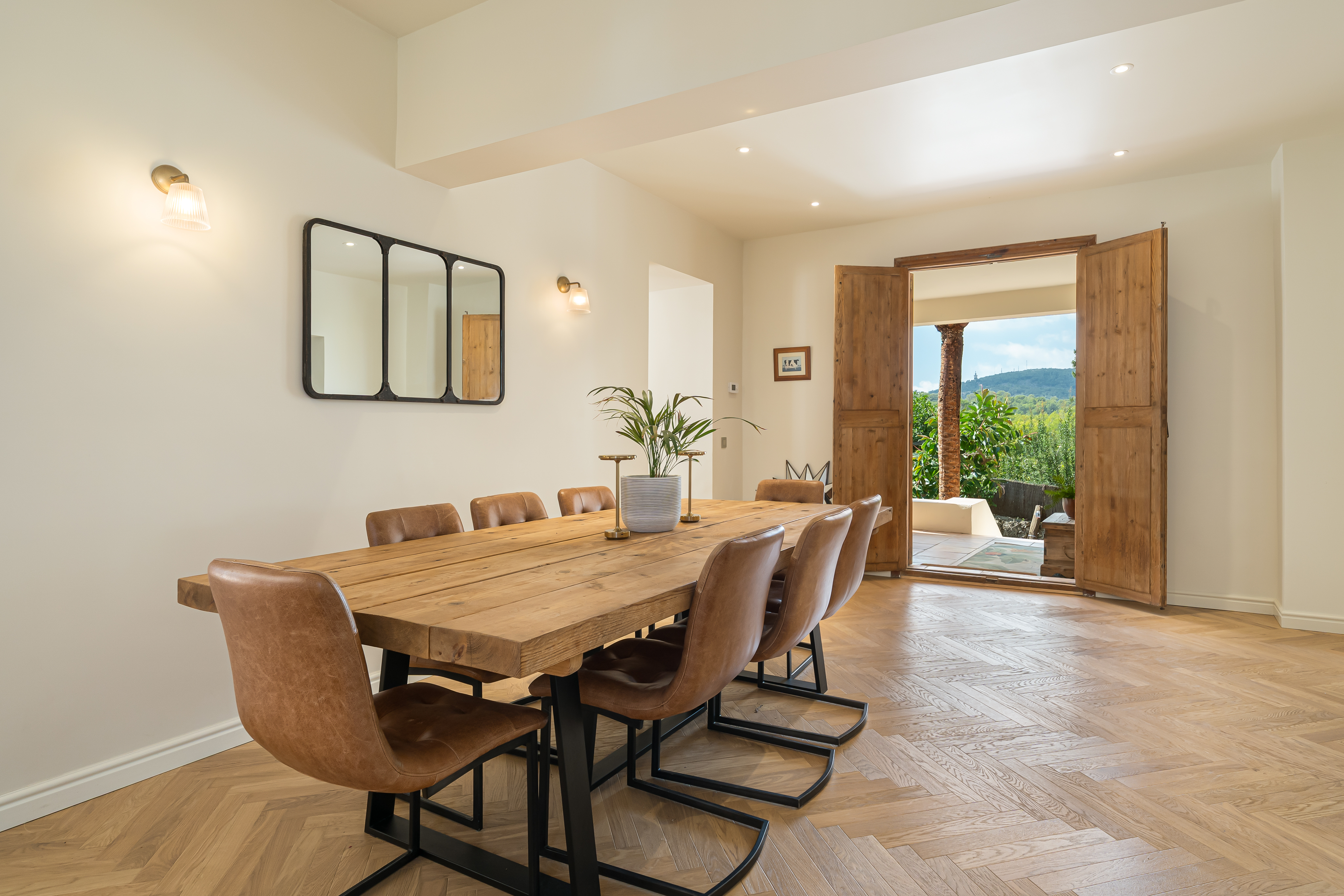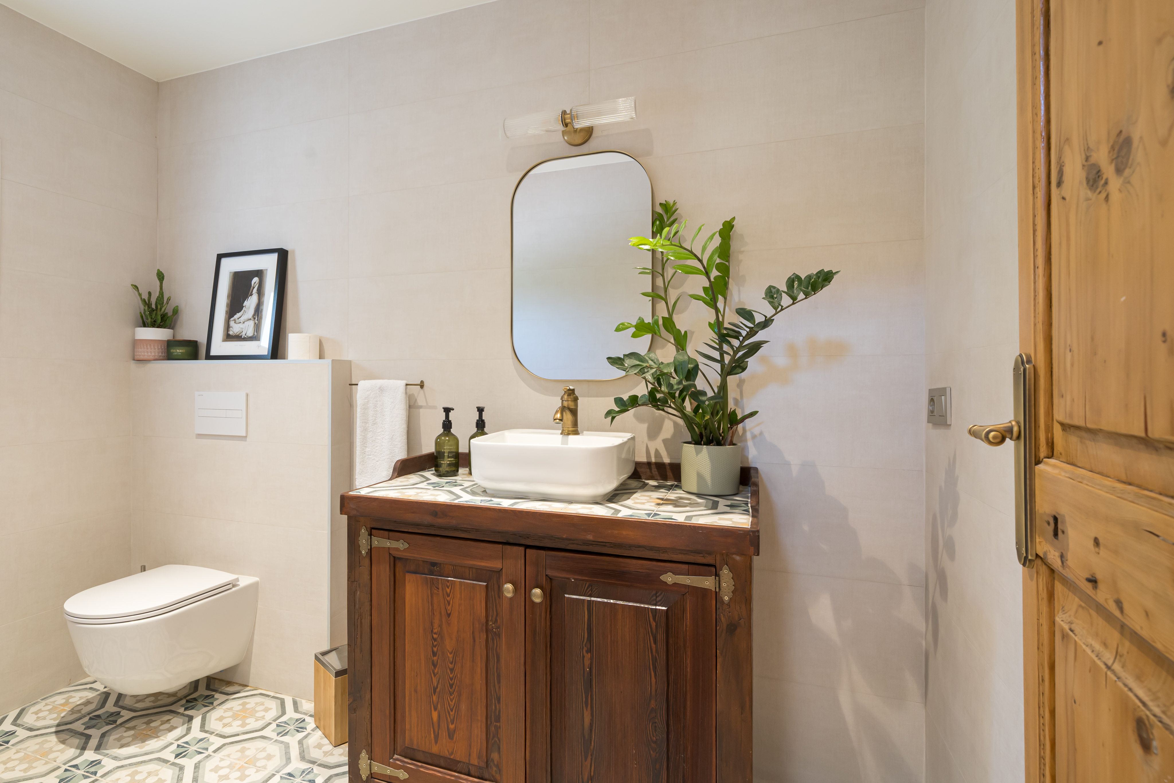The layout is built for real life at scale. The main residence offers four generous bedrooms and a dedicated office across three floors. The guest apartment — accessed independently — can work equally well as staff quarters, a wine cellar with tasting room, or a private home office suite depending on how you want to live. Then there's the separate guest house: a genuinely versatile structure with three bedrooms that functions entirely independently from the main house. Convert it into a private fitness studio, a social and entertaining space for larger gatherings, or simply use it as a self-contained home for family or guests who value their privacy as much as you value yours. The full compound sits on 2,500 square metres of landscaped garden with a saltwater pool at its centre and the Serra de Tramuntana on the horizon.